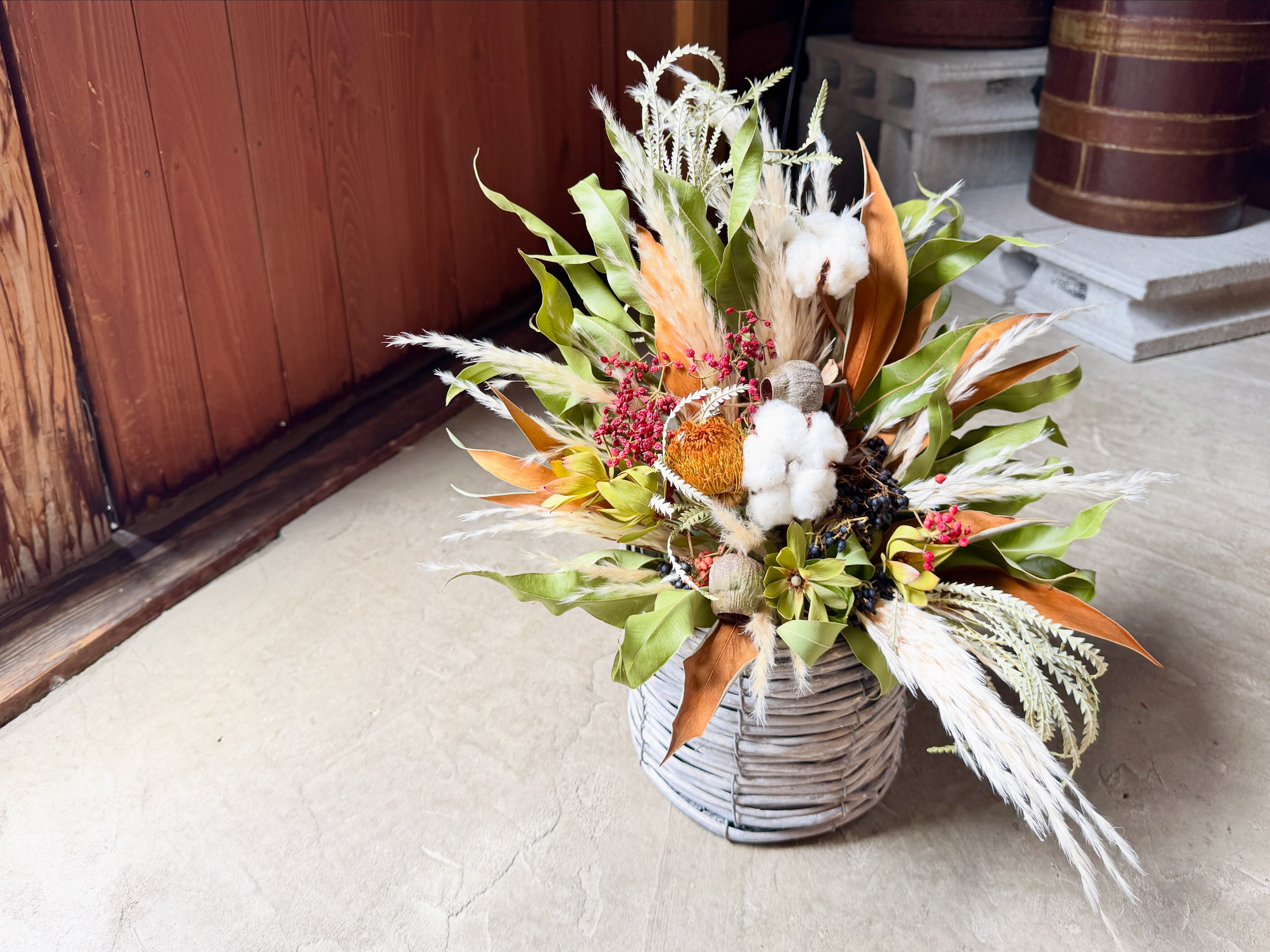 生花、ドライフラワー、プリザーブドフラワーは全て繊細な自然素材の為、細心の注意を払って梱包致しますが運送中の揺れにより葉、花、実物等が落ちる場合がございます。ご理解をいただけますとありがたく存じます。
